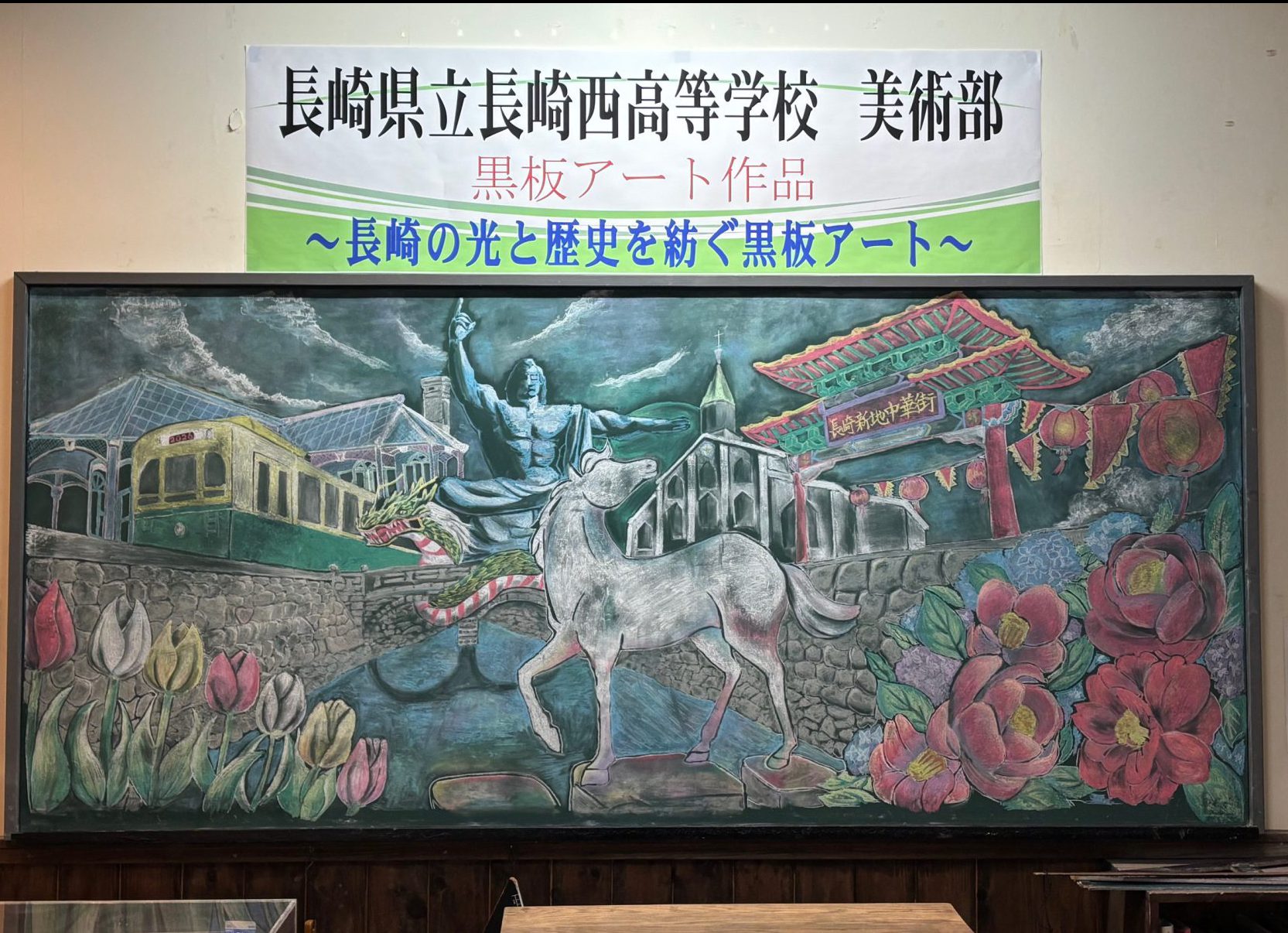 昨年12月、縦約120cm・横約275cmの黒板に、12人の生徒が約6時間かけて制作。平和祈念像や大浦天主堂、新地中華街、眼鏡橋など長崎らしい風景を背景に、馬が中島川を渡る躍動感ある作品となっています。